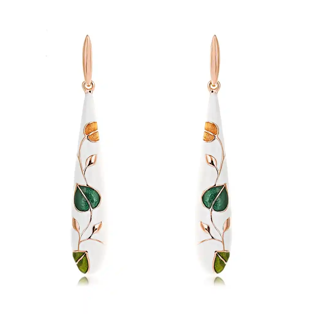 Hermosos Aretes largos elaborados en latón con baño de oro rosado, diseño en forma de hojas color verde esmeralda . Cierre a presión. Largo Aretes: 6 cm Joyería de alta calidad y duración, caracterizada por diseños únicos para una mujer delicada, sofisticada y que busca accesorios que complementen su outfit en toda ocasión.