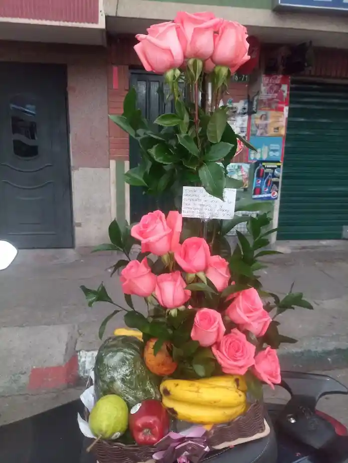 arreglo con 12 rosas, canasto de madera, y frutas a su preferencia