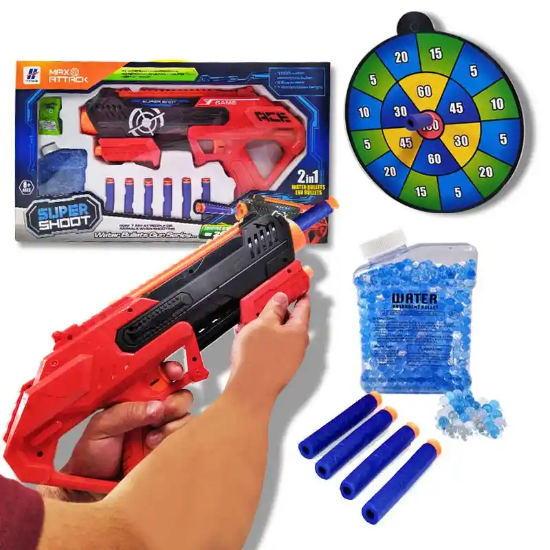 ¡COMPRA SEGURO, EMPRESA CON SERIEDAD Y COMPROMISO! Somos importadores y distribuidores Pregunta precios al por mayor de nuestros productos. "Se necesita más amor de gente buena". Pistola Lanzadora Super Shoot La diversión nunca fue tan emocionante con estas increíble armas de juguete que lanzan dardos de espuma y balas absorbentes de agua. Tiene una distancia de disparo máximo de 20 metros. Incluye 6 dardos, 800 balas absorbentes de agua listas para recargar el arma y un paquete con 500 más que tendrás que introducir en agua y esperar varias horas a que crezcan para nuevamente llenar el frasco. en total son 1300 municiones de estas para que puedas disfrutar por mucho tiempo tu juguete. Esta también esta equipada por unos lentes protectores para que estés mas seguro cuando juegues con otros amigos. Medida Arma: 36 cm de largo x 20 cm de Alto. Medidas Caja: 49 cm de Largo x 27.5 cm de Alto x 6.5 cm de Ancho. Material: Plástico Juguetes, cuentos, y cualquier producto orientado a la satisfacción y desarrollo de los niños. Diversión, entretenimiento y aprendizaje. Los juguetes siempre han desempeñado un papel importante en la vida de los niños, siempre considerando los gustos y deseos de los más pequeños de la casa y no tan pequeños, procurando dar la mejor de las sorpresas y ganarse esa sonrisa incomparable que los llena de felicidad.