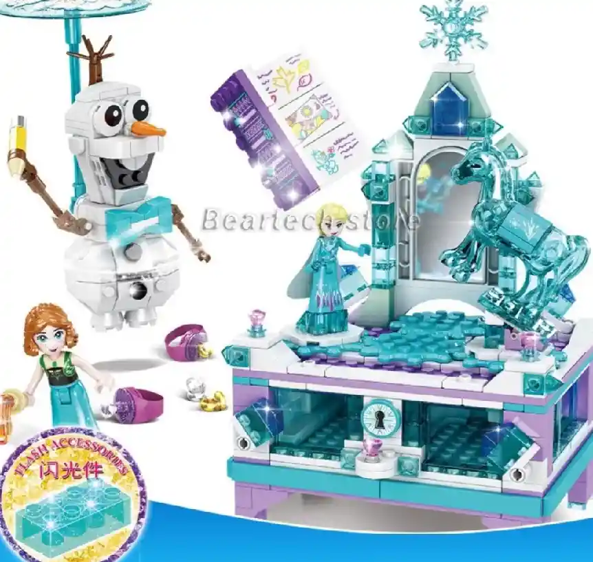 Joyero Mágico de Frozen Este hermoso set incluye dos minifiguras diferentes Elsa y Anna con mas de 520 piezas para armar. Trae una figura armable de Olaf El Joyero tiene adentro del cajón 2 anillos con accesorios para armar En la parte de arriba tiene un espejo (papel metálico) y dos bases giratorias una para la minifigura y otra para un caballo de Hielo.