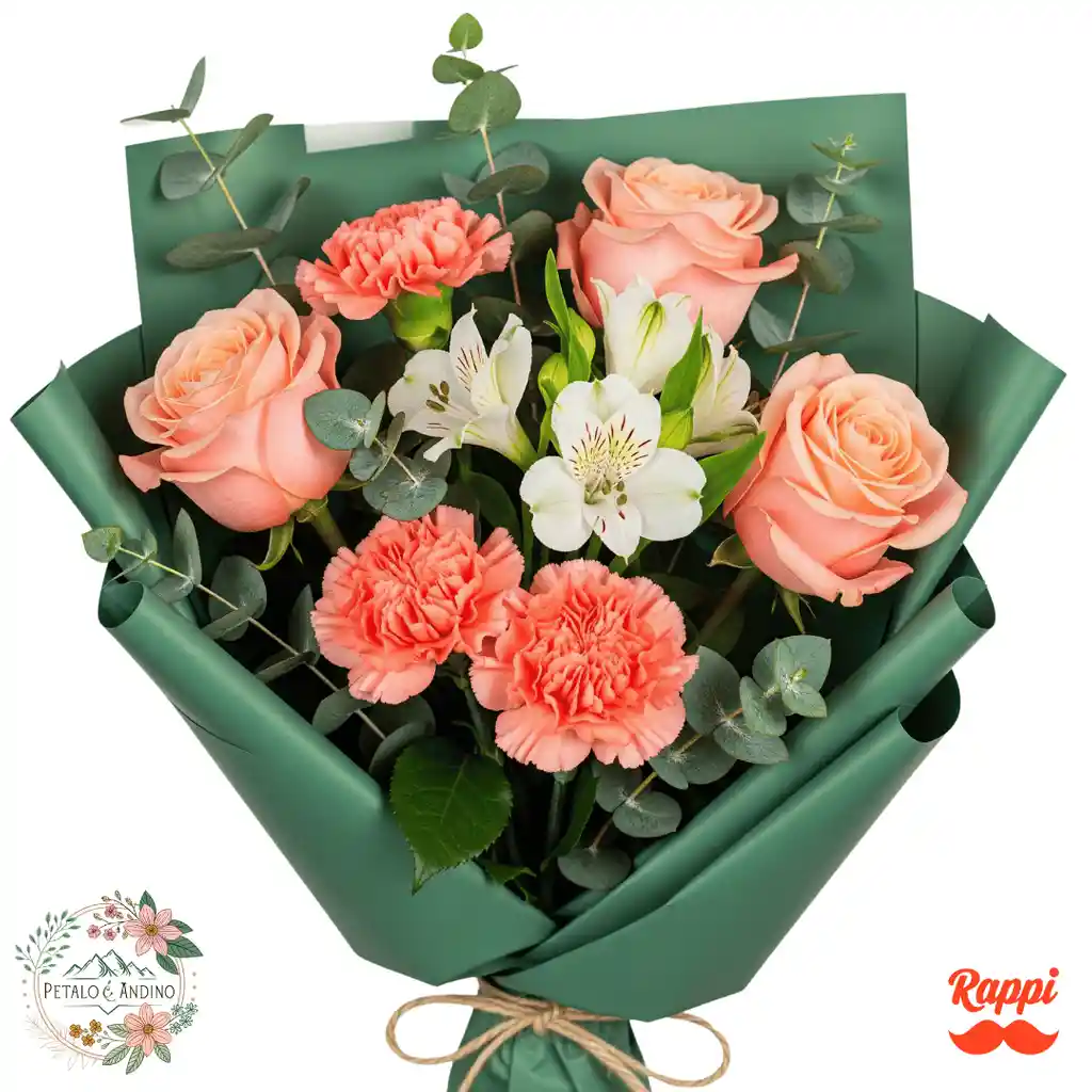Este encantador ramo de flores presenta una delicada combinación de 3 tallos de rosas color salmon, clavel rosado y alstroemeria blanca, realzados con ramas de hojas de eucalipto. La armonía de los tonos rosa, salmón y blanco crea una estética suave y elegante, perfecta para cualquier ocasión. El bouquet viene envuelto en papel coreano de un solo color, cuya tonalidad puede variar según la disponibilidad.