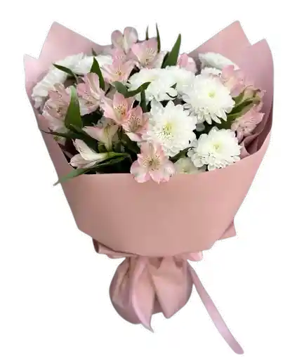 Bouquet floral en tonos blancos y rosados, elaborado con flores frescas de alta calidad y un diseño profesional delicado y moderno. Algunas flores pueden variar sutilmente según la temporada, manteniendo siempre la frescura, el estilo y el valor del arreglo. Incluye tarjeta personalizada sin costo para acompañar tu mensaje especial.
