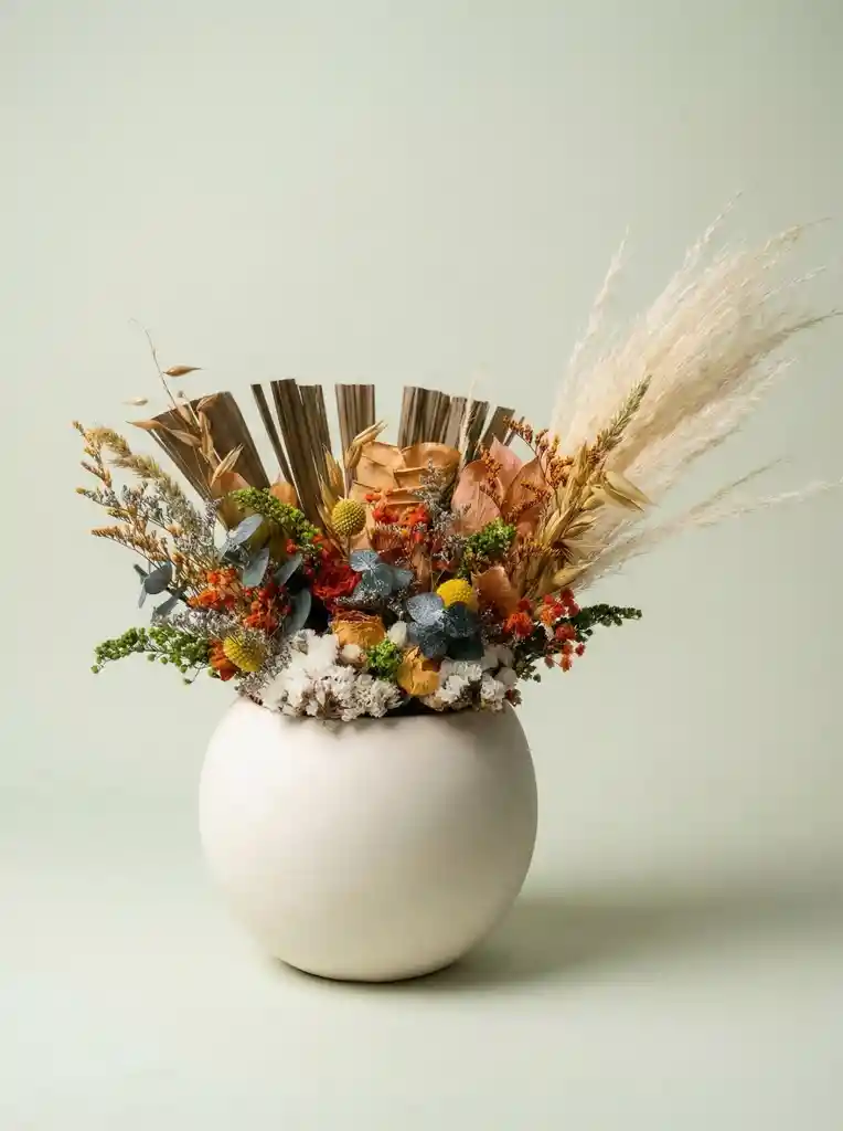 "Arreglo artesanal de flores y follajes secos que celebra los tonos cálidos de la tierra. Combina texturas suaves como la pampas, detalles rústicos en hojas secas y acentos vibrantes en amarillos, naranjas y verdes. Su diseño orgánico y equilibrado lo convierte en una pieza ideal para espacios modernos, acogedores y llenos de estilo. Perfecto para dar un toque natural y a cualquier ambiente. incluye jarron en ceramica blanca