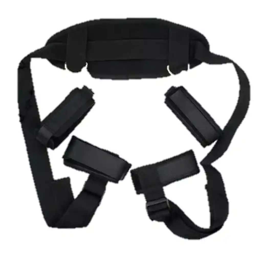 Arnés araña que sujeta pies y manos, manteniéndolos elevados con correas ajustables para mayor control y comodidad. Incluye 2 esposas para manos, 2 esposas para pies y 2 cinturones ajustables