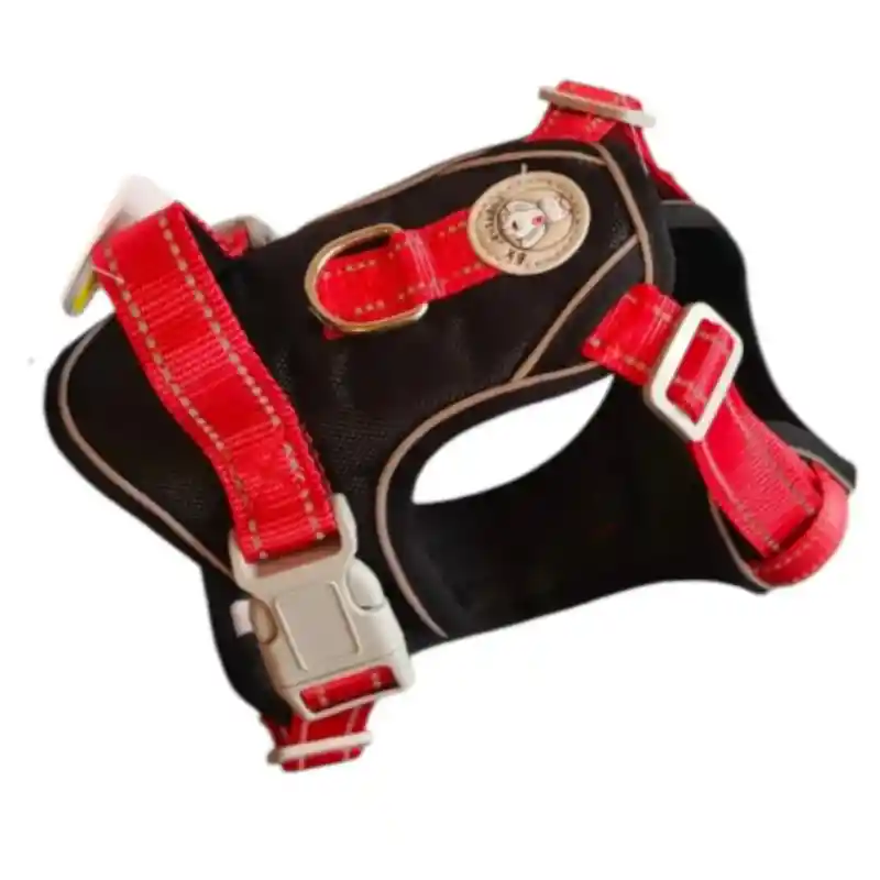 Resistente y cómodo arnés tipo pechera para perros, diseñado para brindar mayor control y seguridad durante los paseos. Incluye traílla (correa) y cuenta con doble argolla metálica (hebilla): una superior para sujetar la correa y otra inferior que también puede usarse para la traílla o para colocar la placa de identificación. Su diseño permite una mejor distribución de la presión en el pecho, evitando tirones en el cuello y ofreciendo mayor comodidad a la mascota. 🐶 Talla M Ideal para perros medianos. Perfecto para razas como: Beagle Cocker Spaniel Bulldog Francés Características: Diseño más amplio y resistente Mejor distribución de la presión Incluye traílla