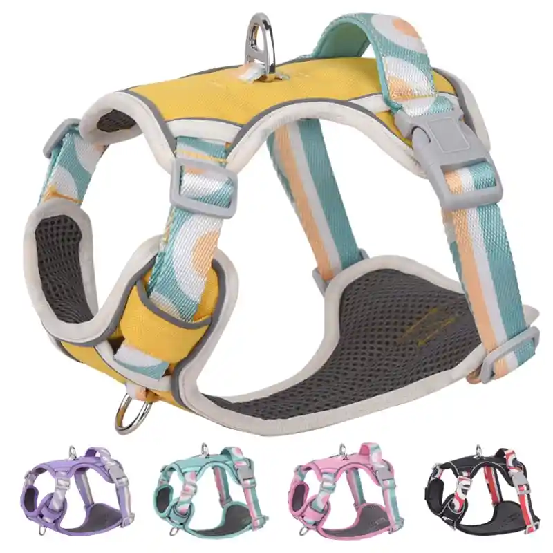 arnés de pecho reforzado. Estos arneses son populares por su diseño antitirones y características de seguridad. Características Principales Diseño Antitirones: Cuenta con un anillo en D frontal para enganchar la correa, lo que ayuda a redirigir la fuerza y disuadir suavemente al perro de tirar. Ajustable y Cómodo: Dispone de cuatro correas ajustables para un ajuste personalizado y seguro, evitando rozaduras. Está hecho de material de malla transpirable y acolchado para mayor comodidad. Seguridad Reflectante: Incorpora tiras reflectantes que aumentan la visibilidad y seguridad durante paseos nocturnos o en condiciones de poca luz. Construcción Duradera: Fabricado con materiales resistentes como tela Oxford y poliéster, con costuras reforzadas. También presenta hebillas de liberación rápida para ponerlo y quitarlo fácilmente. Versatilidad: Es adecuado para perros pequeños, medianos y grandes, y se puede utilizar para paseos diarios, entrenamiento y correr. COLORES DISPONIBLES: AMARILLO CON VERDE Y ROJO CON NEGRO