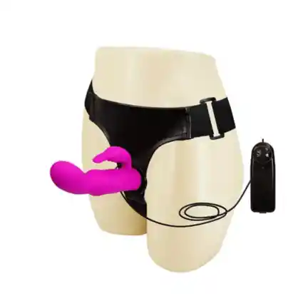 Este Arnés con vibrador es un increíble arnés que se controla a través de control remoto unido a un cable, incluye vibrador dual de silicona que posee una parte insertable y además un estimulador de clítoris con forma de conejito para una mejor experiencia, su material es de silicona lo que lo hace muy suave al tacto. El arnés posee correas elásticas lo que lo hace perfecto para que se adapte a cualquier cuerpo. Además destaca por ser muy potente