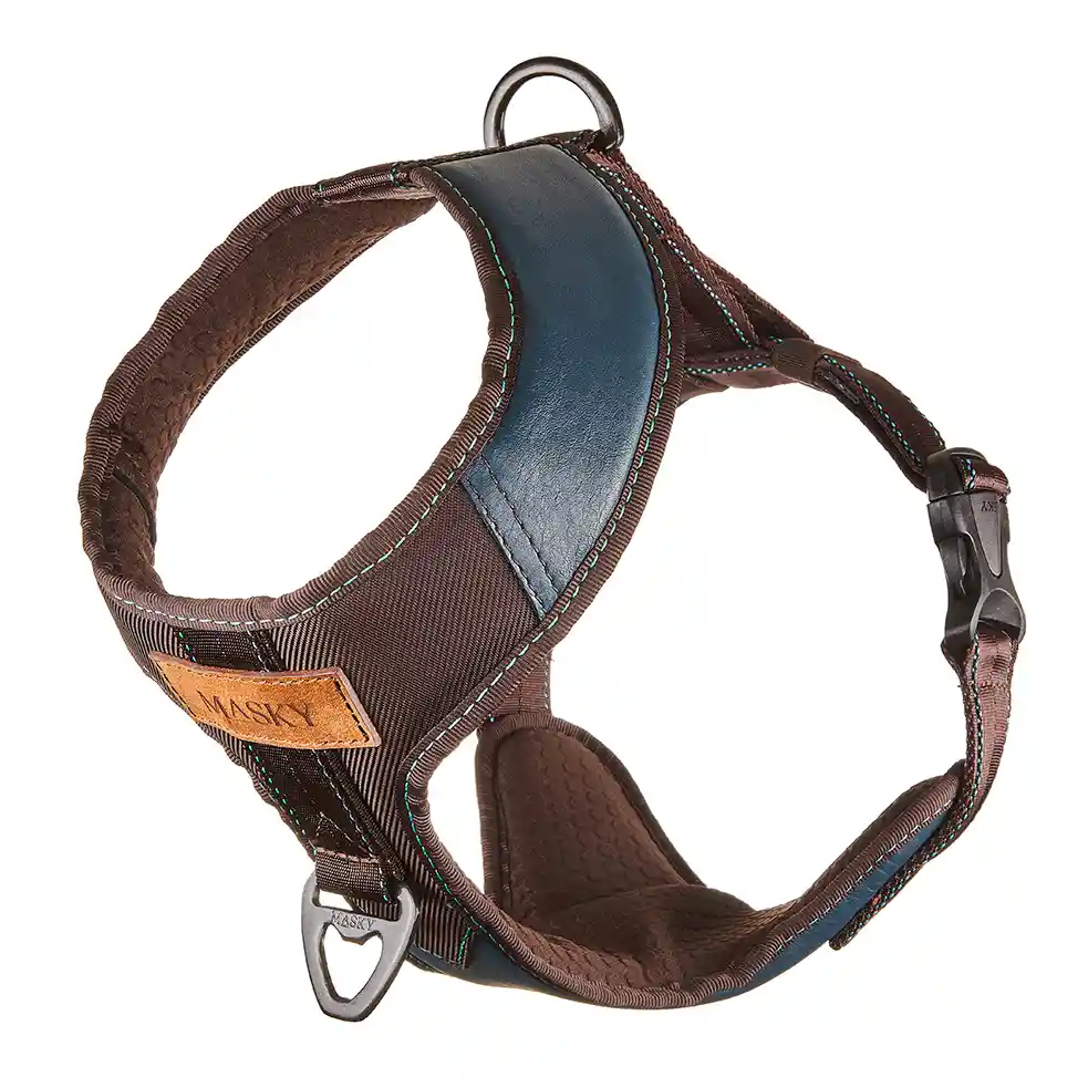 Arnés tipo pechera elaborado en 100% cuero, interior en material suave y confortable, sus herrajes y hebillas son muy resistentes, brindando mayor seguridad a tu perro. Tiene 2 puntos de fijación para la correa: el anillo trasero y uno delantero anti tirones para mayor control. El cuero de nuestros arneses resiste condiciones leves de humedad y es muy facil de cuidar. Nuestros productos son diseños exclusivos elaborados en Colombia por artesanos Maestros del cuero. Nos inspiramos por el amor a nuestras mascotas y la pasión por la moda y el cuero. ¡Queremos que tu peludo siempre se vea WOW!