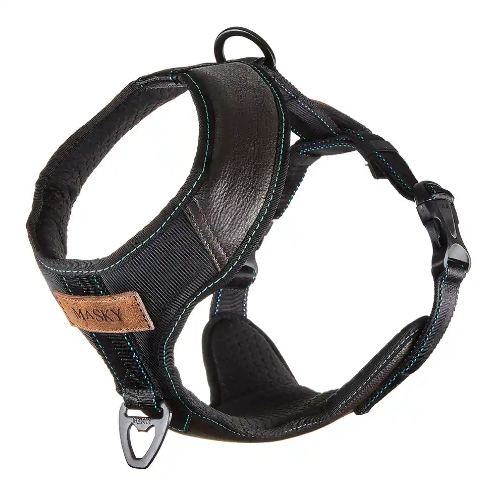 Arnés tipo pechera elaborado en 100% cuero, interior en material suave y confortable, sus herrajes y hebillas son muy resistentes, brindando mayor seguridad a tu perro. Tiene 2 puntos de fijación para la correa: el anillo trasero y uno delantero anti tirones para mayor control. El cuero de nuestros arneses resiste condiciones leves de humedad y es muy facil de cuidar. Nuestros productos son diseños exclusivos elaborados en Colombia por artesanos Maestros del cuero. Nos inspiramos por el amor a nuestras mascotas y la pasión por la moda y el cuero. ¡Queremos que tu peludo siempre se vea WOW!