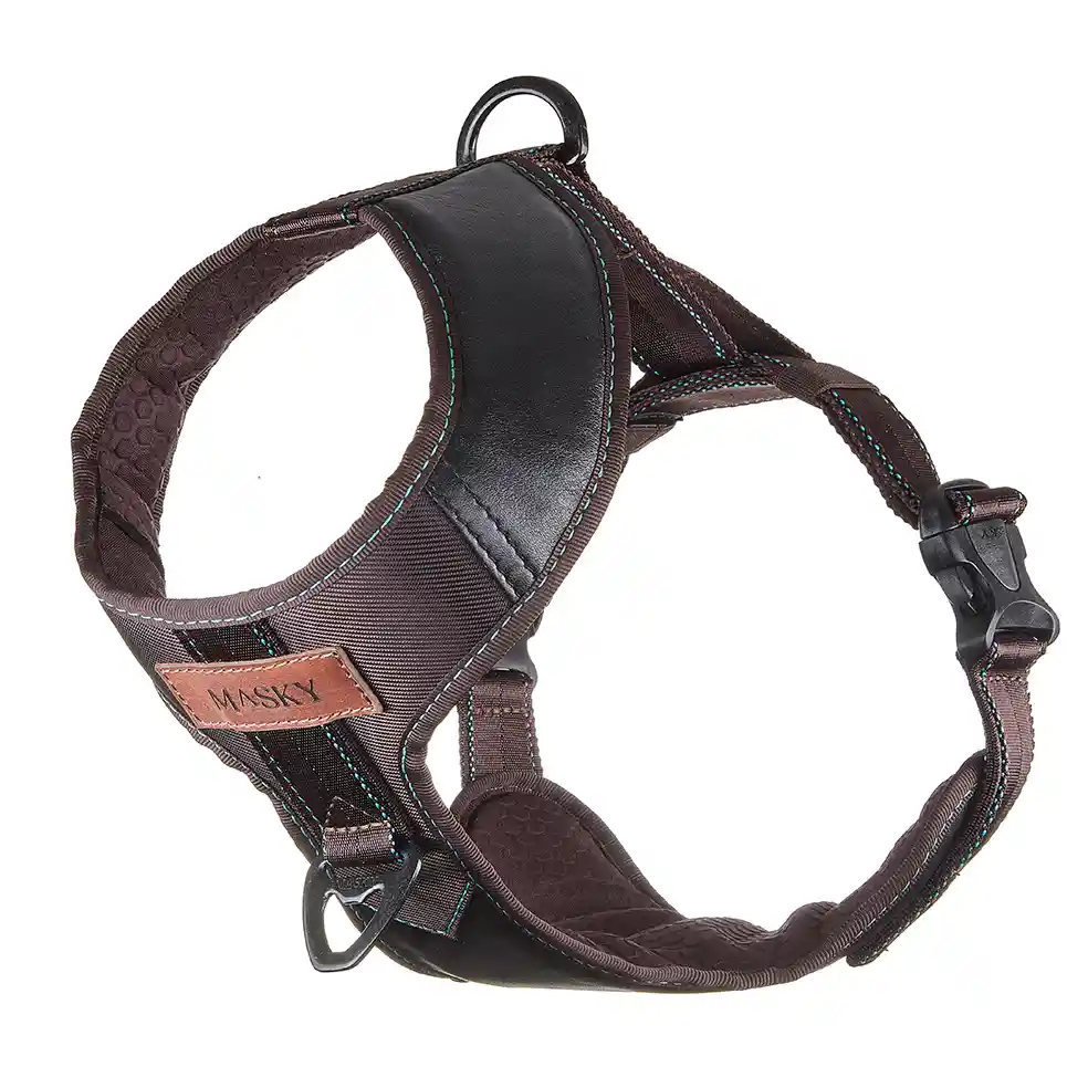 Arnés tipo pechera elaborado en 100% cuero, interior en material suave y confortable, sus herrajes y hebillas son muy resistentes, brindando mayor seguridad a tu perro. Tiene 2 puntos de fijación para la correa: el anillo trasero y uno delantero anti tirones para mayor control. El cuero de nuestros arneses resiste condiciones leves de humedad y es muy facil de cuidar. Nuestros productos son diseños exclusivos elaborados en Colombia por artesanos Maestros del cuero. Nos inspiramos por el amor a nuestras mascotas y la pasión por la moda y el cuero. ¡Queremos que tu peludo siempre se vea WOW!