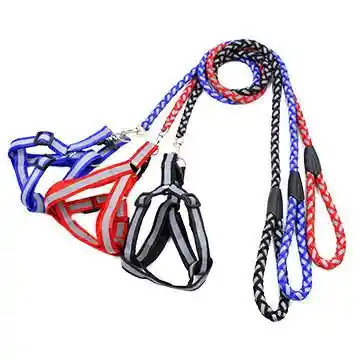 Conjunto de pretal y correa para perros. Hechos de cinta de fibra de poliester con cinta refractaria que lo hace visible en la oscuridad. (ideal para perros medianos)
