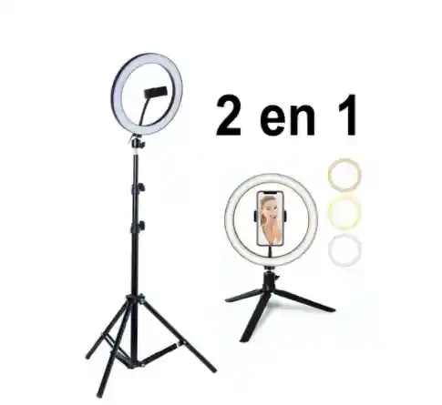 Aro de luz 26 CM de Diámetro + Tripode Profesional de 2.10 Metros de altura sin la Luz + Mini trípode de escritorio .!! 2 trípodes en 1 compra.CARACTERÍSTICAS:- Luz Led- 10 Intensidades de Luz- 3 Diferentes Temperaturas de color- Conexión por cable USB de 5V. (No o incluye adaptador)TE ENTREGAMOS:1-Aro de Luz de 26 CM de Diametro con control adherido al cable USB para intensidad y temperatura de color1-Soporte Para Celular gira 360 grados1-Cable USB1-Tripode de altura maxima 2.10 Metros1-Minitripode para escritorio1-Accesorio para que el aro rote 360 Grados.