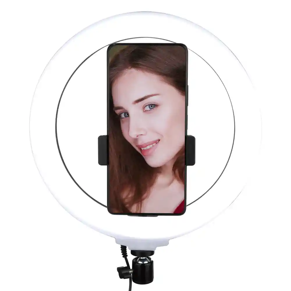 Alimentación USB · 30W · Tamaño aro 33 cms · Soporte 360 para celular · Luces LED · Incluye trípode 2.10mts, control remoto y accesorios