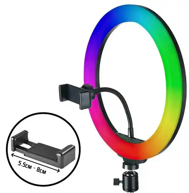 Graba las mejores tomas y videos con el Aro de luz RGB led con diámetro de 36 cm Tiene varios niveles de intensidad, la luz cambiará significativamente en cada nivel. Luces RGB en diferentes luces de colores LED para efectos increíbles en imágenes o vídeos. Hace imágenes mucho más nítidas y más detalladas. Ligero y portátil para llevar a donde quiera que vayas. Tiene luz cálida y luz fría, las cuales se pueden combinar para variar el tipo de iluminación. CARACTERÍSTICAS: - Diámetro aproximado 36 cm - Largo aproximado del cable 180 cm - Trípode con altura máxima aproximada 2 METROS - 7 colores y hasta 15 combinaciones de iluminación - Intensidad y temperatura de color variable y regulable - Incluye el control para el cambio del color del aro. INCLUYE 1-Aro De Luz Led 26 Cm Fotografía Selfie 1-Soporte para celular 1-Trípode de 2m