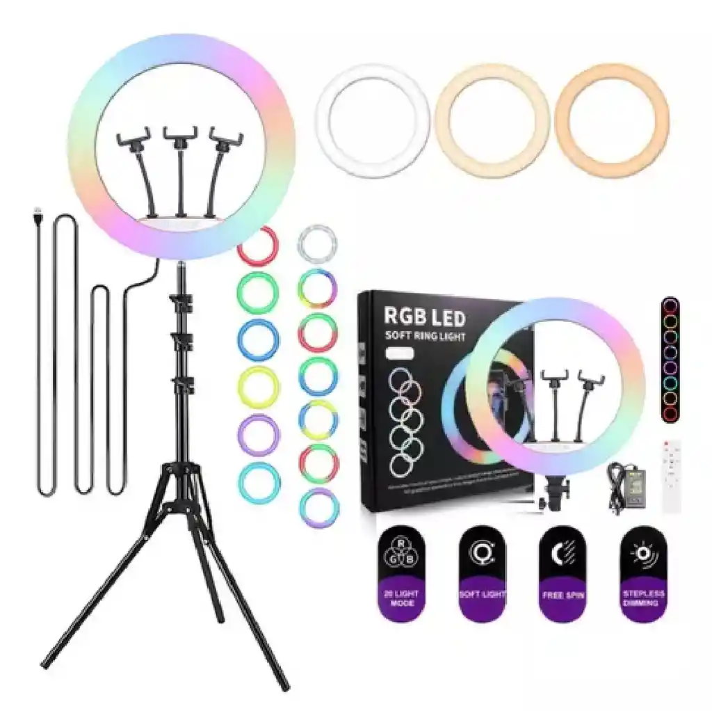 Aro De Luz 45 Cm Rgb Led Trípode Profesional Control Remoto Color de la estructura Negro El Aro de Luz 45 cm RGB LED Trípode Profesional es el accesorio perfecto para iluminar tus fotos y videos con estilo. Con su diseño elegante y moderno en color negro, este aro de luz te brinda la posibilidad de ajustar la intensidad de la luz gracias a su función dimmable. Además, su potencia de 35W y tecnología LED garantizan una iluminación de calidad y duradera. Incluye un práctico porta celular, ideal para que puedas grabar tus contenidos de manera profesional. Además, su marca Joma es sinónimo de calidad y confianza en el mercado.