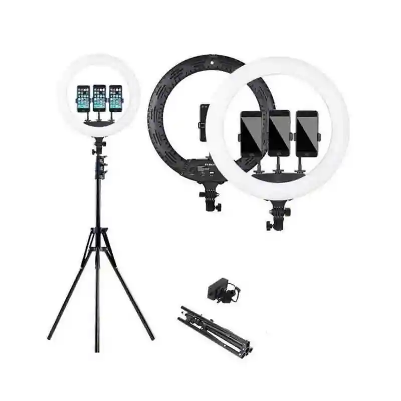 Aro de luz 45 cm luz blanca, calida, incluye tripode, tres soportes para celular, estuche