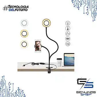 El diseño de luz led con brillo ajustable satisface todas sus necesidades en diferentes circunstancias además de contar con un soporte de 360° para su teléfono El ancho de este soporte para teléfono celular es de 2.28 pulgadas como mínimo a 3.15 pulgadas como máximo, y será compatible con la mayoría de los teléfonos inteligentes. El puerto USB funciona con varios dispositivos. Podrá disfrutar libremente de la lámpara y del soporte del teléfono móvil en cualquier momento. El Clip esta hecho de metal. El ancho de la sección fija se puede ajustar de 0 a 2,75 pulgadas (7 cm). Es compatible con la mayoría de las mesas y escritorios de diferentes grosores. CARACTERÍSTICAS: Longitud total del soporte : 640 mm Tamaño de la lámpara : diámetro exterior 90 mm Longitud de línea : 1.45 M Cantidad de Led : 24 Potencia Led : 12 W Fuente de alimentación : USB 5 Voltios Aro luz : 9 cm Material : Metal y A.B.S Contenido del paquete: 1 aro de luz de 9 cm con soporte flexible de dos brazos , base de Celular, clic y cable de carga con control.