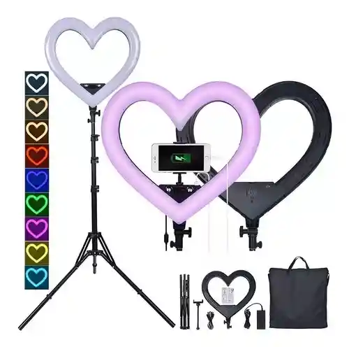 Anillo de luz LED RGB funcional: el anillo de luz LED RGB profesional en forma de corazon cuenta con 124 luces LED integradas, 256 colores RGB y 25 modos de iluminacion RGB; 3 modos de iluminacion de color regulares que son blanco, amarillo calido, blanco calido con 12 niveles de brillo para elegir; angulo de haz grande de 180°; temperatura de color regulable de 3000 K a 6000 K; el brillo puede alcanzar los 500 lumenes. facil acceso a varias luces modos para personalizar su iluminacion preferida para sus necesidades de creacion de fotografia