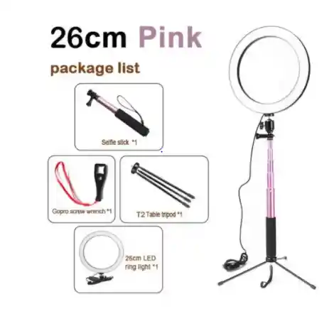 Aro de luz led de 26cm con soporte trípode. bluetooth selfie te ayuda cuando necesites luz extra para maquillaje . tomar fotos . videos y demasContenido:1 Aro de luz 26 cm1 accesorio para ajustar 360 grados1 tripode ajustable a 1.40.cm color rosa1 control remoto1 soporte celular