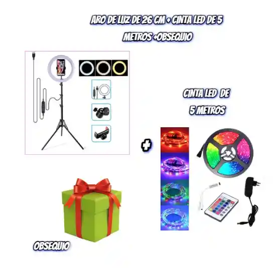 ¡Ilumina tu mundo y captura momentos increíbles con este combo sensacional! Aro de Luz LED de 26cm + Cinta de Luz LED 5 Metros Multicolor + Obsequio: El kit perfecto para mejorar la iluminación en tus fotografías, vídeos, selfies y transmisiones en vivo, y para crear ambientes vibrantes y llenos de color en cualquier espacio. Aro de Luz LED: Diámetro de 26 cm: Proporciona una iluminación uniforme y favorecedora. Luz ajustable: Elige entre luz fría, cálida o neutra para obtener el efecto deseado. Soporte para teléfono móvil: Incluye un soporte para colocar tu teléfono en el centro del aro de luz, ideal para selfies y videollamadas. Trípode extensible: Ajusta la altura del aro de luz a tu conveniencia. Cinta de Luz LED de 5 Metros Multicolor: 5 metros de largo: Cubre un área amplia para crear una atmósfera envolvente. Colores RGB: Elige entre una amplia gama de colores y efectos de iluminación. Control remoto: Controla los colores, la intensidad y los efectos de la luz desde la distancia. Adhesivo: Fácil de instalar en cualquier superficie. Corte flexible: Adapta la cinta de luz a la forma que desees. Este combo es ideal para: Fotógrafos y videógrafos: Mejora la calidad de la iluminación en tus tomas. Influencers y streamers: Crea contenido atractivo y profesional para tus redes sociales. Amantes del maquillaje y la belleza: Consigue una iluminación perfecta para tus selfies y tutoriales. Creadores de contenido: Ilumina tu espacio de trabajo y captura momentos increíbles. Decoradores: Crea ambientes vibrantes y llenos de color para fiestas, eventos o tu hogar. ¡No esperes más y adquiere este combo increíble hoy mismo!