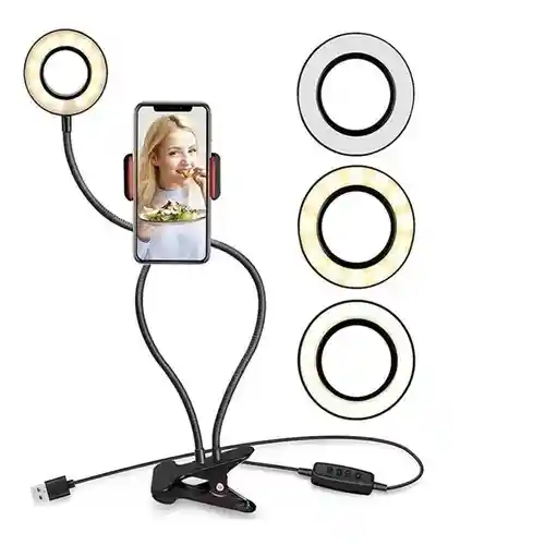 DESCRIPCIÓNMini Aro de luz 3 modos de luz LED. transmisión en vivo profesional. Youtube. Tiktok y uso de maquillaje. anillo de luz para Selfie con soporte para teléfono celular el cual puedes girar 360°- 3 Tonos- Protección ocular luz suave- Fuente de alimentación USB 5V2A- Temperatura del color 3000K /4500K /6000K- Regulación de luz 10 puestos