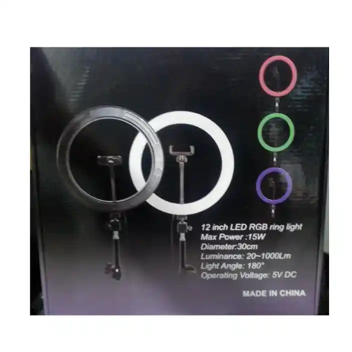 Aro de Luz LED RGB 30cms de diámetro ideal para hacer grabaciones y fotos semi-profesionales • Potencia: 15W • Luminiscencia: 20 – 1000Lm • Ángulo máximo: 180º • Tamaño: diámetro 30 cm • Voltage: 5V DC • Color de luces: RGB variación por control remoto .