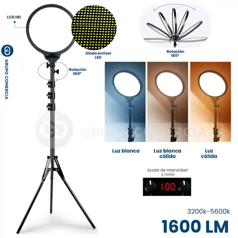 Eleva tu juego de iluminación con el Aro de Luz Profesional y Trípode de 2 Metros. Diseñado para satisfacer las demandas de los creadores de contenido, fotógrafos y entusiastas de la belleza, este set ofrece versatilidad, calidad de iluminación y comodidad excepcionales. Con una rotación de 180 grados, ajuste de color y brillo, este aro de luz es tu aliado ideal para obtener la iluminación perfecta en cada situación. Características Destacadas: Iluminación Profesional: Ofrece luz blanca de alta calidad para resaltar tus contenidos y proyectos. Temperatura y Brillo Ajustables: Rango de temperatura de color de 3200K a 5600K y ajuste de brillo para adaptarse a diferentes escenarios de iluminación. Rotación Versátil: Aro de luz con rotación de 180 grados para ajustar el ángulo de iluminación. Trípode Ajustable: Trípode de 2 metros de altura ajustable para adaptarse a diversas alturas y situaciones de trabajo. Medidas del Aro: 26cm de diámetro para una cobertura uniforme y suave. Especificaciones Técnicas: Aro de Luz: Diámetro: 26cm Temperatura de Color: 3200K-5600K Intensidad de Brillo: 1600LM Ángulo de Rotación: 180 grados Color de Luz: Blanco Calidad de Luz: Alta Trípode: Altura: Ajustable hasta 2 metros Material: Aleación de aluminio resistente Estabilidad: Patas antideslizantes Contenido del Set: 1 Aro de Luz Profesional con ajuste de color e intensidad 1 Trípode ajustable de 2 metros Adaptador de corriente Bolsa de transporte Desde la creación de contenido hasta la fotografía profesional, el Aro de Luz Profesional y Trípode es tu solución versátil para una iluminación óptima. Ajusta la temperatura y el brillo para lograr el ambiente perfecto en cada situación y eleva la calidad de tus proyectos visuales.