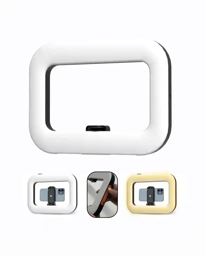 Aro de Luz Cuadrado Tres Tonos Recargable YM200 Tres tonos Incluye soporte para celular/cámara Recargable Color: 2500k-8500k Potencia de 20W Medidas: ancho 29cm alto 22cm