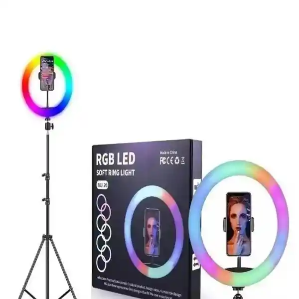 ombre del producto: Aro de luz LED suave RGB BMJ 26 Características: aro de luz LED con colores RGB Uso: Se utiliza para la iluminación en fotografía, videografía, y para transmisiones en vivo (streaming).