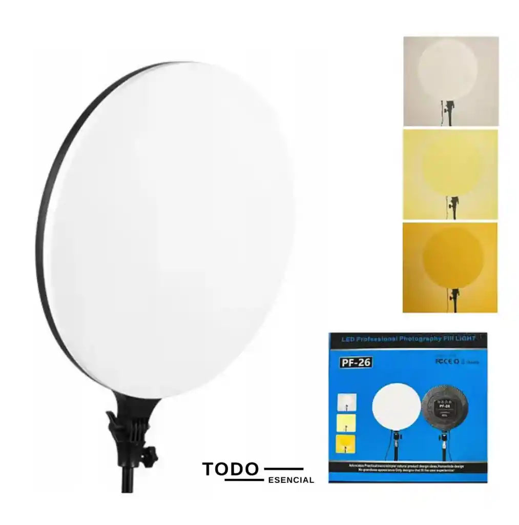 La lámpara LED redonda PF-26 es una solución de iluminación profesional asequible para la toma de fotografías y vídeos, la fotografía de sujetos y la iluminación adicional. La lámpara dispone de 3 modos de iluminación: blanco cálido, frío y neutro. La ventaja de esta lámpara es su alto índice de reproducción cromática, que te ayudará a trabajar con el color y los detalles, así como su tamaño compacto. La lámpara redonda universal será una herramienta excelente en las manos adecuadas. La lámpara viene con un soporte con cabezal 3D que le permite girarla en cualquier ángulo hacia delante y hacia atrás. El mando a distancia con cable permite ajustar el brillo, la temperatura y cambiar entre los modos de luz. Se trata de una lámpara moderna con calidez regulable. Gracias a ella, obtendrá una luz profesional que no parpadea y se distribuye uniformemente y sin sombras. La lámpara LED redonda es fácil de usar. Se puede colocar fácilmente en un trípode. La lámpara se conecta directamente a la red eléctrica. Ventajas: Cuerpo compacto, portátil y ligero, fácil de transportar. Uso en fotografía móvil y vídeo, fotografía de detalle y como luz suplementaria. Regulación continua de la luminosidad y la temperatura de color mediante mando a distancia. Tres modos de temperatura de color: cálido, frío y neutro. Montura para trípode con rosca estándar que permite el montaje vertical y horizontal. Especificaciones: Modelo: PF-26 Temperatura de color: 3200-5700 K Modos de brillo: cálido/frío/neutro Iluminación: Ra95+ Diagonal: 45 cm Alimentación: 220 V Longitud del cable: 140 cm Mando a distancia Panel Redondo 25cm