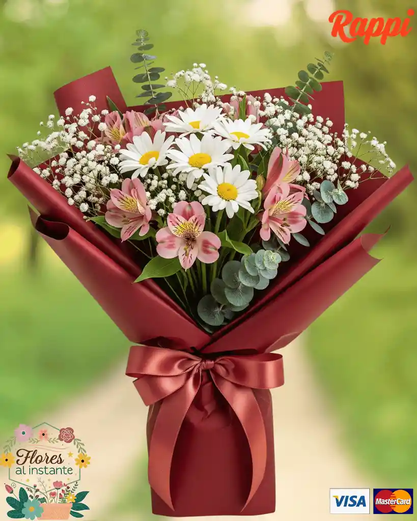 Un bouquet que evoca la frescura y la sencillez de un jardín. Envuelto en un elegante papel coreano, este arreglo combina la pureza de 6 margaritas blancas con la delicadeza de 5 astromelias rosadas. La gipsófila blanca y el follaje de eucalipto le dan un toque extra de volumen, creando un estilo natural y lleno de vida.