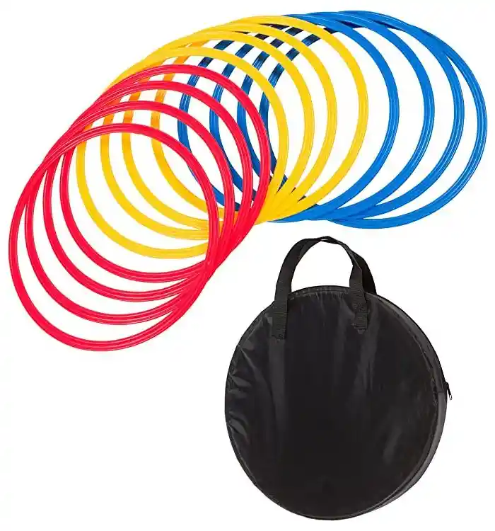 Aros De Agilidad X 12 Entrenamiento Deportivo Coordinación Velocidad . El set está compuesto por 12 aros de gran ligereza, altamente flexibles y extraplanos para evitar que entorpezcan el entrenamiento. Hecho de plástico PVC para crear anillos de agilidad lo suficientemente resistentes como para manejar innumerables sesiones y soportar las inevitables pisadas y patadas. Permiten realizar gran variedad de ejercicios de entrenamiento y rutinas para multitud de deportes. Desarrolla habilidades relacionadas con la velocidad y la agilidad, mejora la condición física y el equilibrio. Los aros de entrenamiento son cada uno de 49 cm de diámetro. - Set de 12 aros de agilidad. - Extraplanos, independientes y flexibles. - Diámetro: 49 cms. - Material: PVC de alta calidad. - Color: Amarillo, Azul, Rojo. El paquete incluye: - Set de 12 aros de agilidad. - Incluye bolso de traslado. Producto disponible para entrega inmediata. Producto completamente nuevo con Garantía de 12 meses, se entrega en su empaque original y garantía por escrito