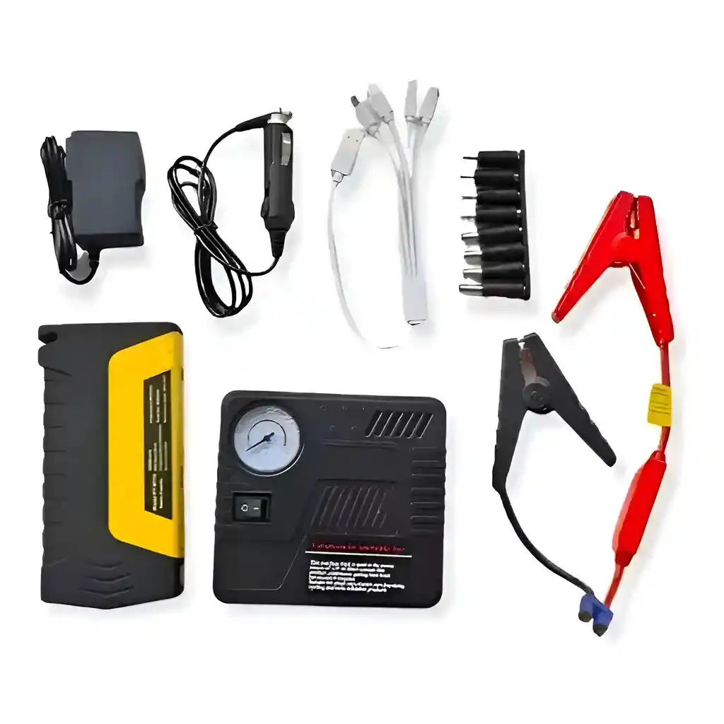 Este completo kit de emergencia vehicular es la herramienta indispensable para cualquier conductor, diseñado para ofrecer seguridad y autonomía en situaciones críticas en la carretera. El núcleo del sistema es un potente arrancador de batería (Jump Starter) portátil capaz de encender motores a gasolina y diesel de 12V, el cual también funciona como una Power Bank de alta capacidad con múltiples puertos USB para cargar dispositivos móviles y laptops. El conjunto incluye un compresor de aire compacto con manómetro integrado para inflar neumáticos rápidamente, una linterna LED de alta intensidad con funciones de auxilio (SOS) y un maletín rígido de transporte que mantiene todos los accesorios organizados. Con su diseño robusto y multifuncional, este equipo combina potencia y versatilidad, permitiéndote resolver fallos de batería, neumáticos bajos o falta de energía en tus dispositivos electrónicos de manera eficiente y segura. Ficha Técnica Marca: High Power Modelo: Emergency Mobile Power Supply Kit Voltaje de salida para arranque: 12V Tipo de batería: Polímero de litio de alta capacidad Funciones principales: Arrancador de motor, Compresor de aire, Power Bank, Linterna LED Dimensiones del arrancador: 17 cm (Largo) x 8.5 cm (Ancho) x 3 cm (Grosor) Entradas de carga: 15V / 1A Salidas USB: 2 puertos de 5V / 2A Salida para Laptop: 12V / 16V / 19V Corriente de inicio: 300A Corriente de pico: 600A Modos de linterna: Luz fija, Estroboscópica, SOS (Rojo y Azul) Compresor de aire: Conexión de 12V con manómetro analógico Accesorios incluidos: Pinzas inteligentes, Cargador de pared, Cargador de auto, Cable USB multiconector, Adaptadores para laptop, Boquillas para compresor y Estuche rígido. Términos de garantía:Para defectos de fábrica o retractos: Por favor revise el producto apenas lo reciba y antes de usarlo. No aplican ley de retracto o defectos de fábrica luego de usar el producto. Se manejan máximo 5 días para reportar defectos de fábrica (por ejemplo, producto funciona mal, piezas faltantes, rotas, etc). Para hacer efectiva la devolución el producto debe devolverse con el empaque original, el cual debe estar en buen estado, incluir todos los documentos y las partes completas y sin daños.
