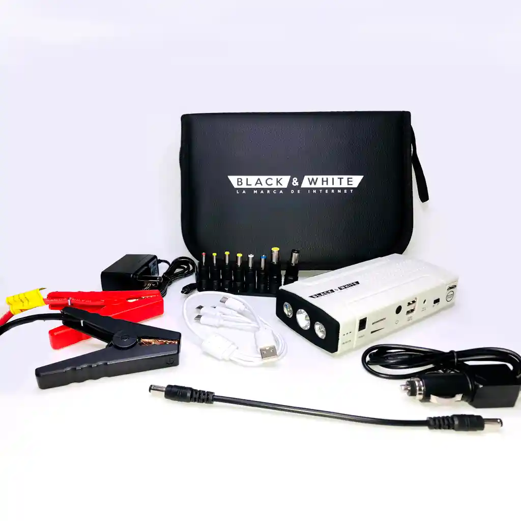 Arrancador Iniciador Cargador de Bateria, Para carros hasta 4500cc, Power Bank (Entrada USB: Iphone / USB C / Mini USB / Micro USB), Linterna / Luz de alerta / Luz de emergencia / Luz de carretera (azul y roja), Medidas: 8.2 cm x 16.5 cm x 3.5 cm, Capacidad bateria 13800 mAh, Corriente de arranque 400A (3seg), Corriente de arranque nominal 200A, Salida arrancador 12V, Salidas 12V - 16V - 19V, Temperatura ambiente de trabajo -20 - 60 grados c, Incluye: Estuche. Juego de pinzas conectoras (cocodrilo. caiman). Cable USB con diferentes entradas de celular. Extension y juego de adaptadores para computador. Cargador de encendedor. Cargador de pared, Garantía: 1 año por defectos de fabricacion
