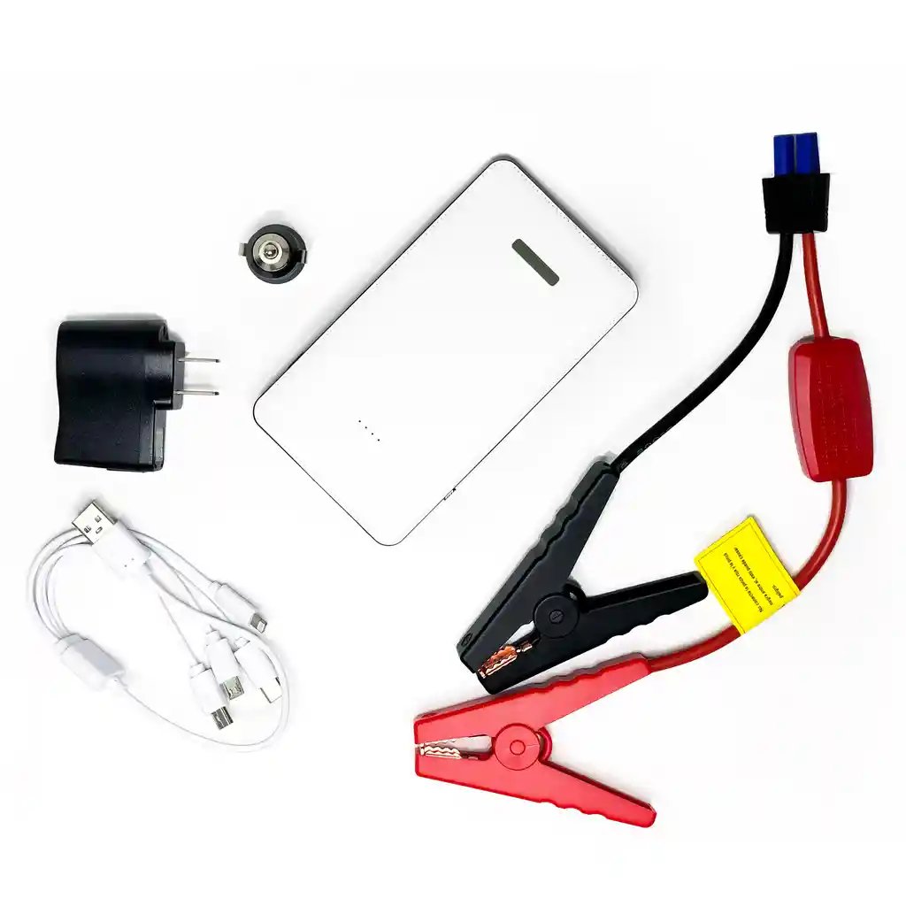 Arrancador Iniciador Cargador de Bateria, Para carros hasta 2500cc, Power Bank (Entrada USB: Iphone / USB C / Mini USB / Micro USB), Linterna / Luz de alerta / Luz de emergencia, Medidas: 7.8 cm x 14.3 cm x 1.4 cm, Capacidad bateria 7800 mAh, Corriente de arranque 300A (3seg), Corriente de arranque nominal 150A, Salida arrancador 12V, Temperatura ambiente de trabajo -20 - 60 grados c, Incluye: Juego de pinzas conectoras (cocodrilo. caiman). Cable USB con diferentes entradas de cellular. Cargador de encendedor. Cargador de pared, Garantía: 1 año por defectos de fabricacion