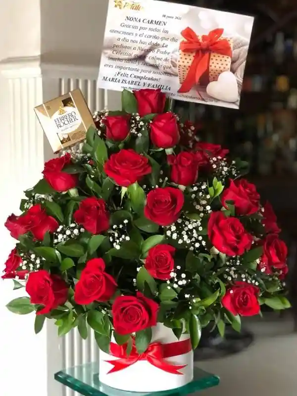 Arreglo floral de 36 rosas aproximadamente, acompañado de una caja de chocolate Ferrero Rocher por 4 unidades y su respectiva tarjeta personalizada. (Valores Aproximados)