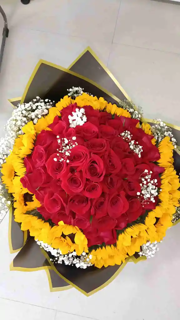 Ramo hecho en 50 rosas rojas, con 18 girasoles, papel coreano a su gusto.