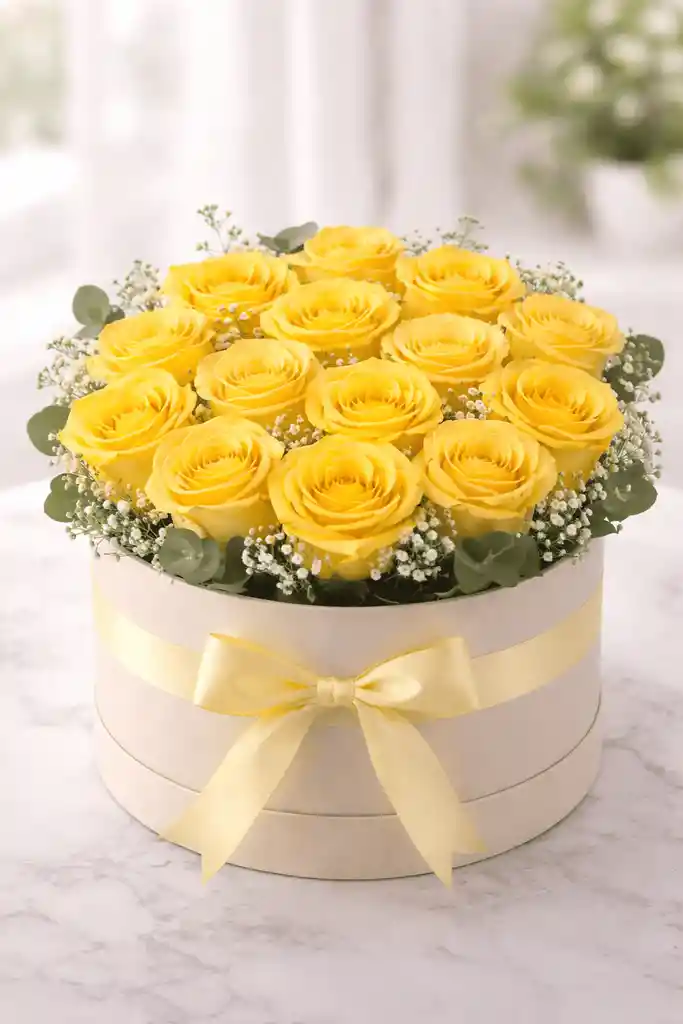 Delicado y elegante arreglo floral en caja circular, compuesto por 18 a 20 rosas frescas amarillas, que simbolizan alegría, amistad y pureza. Diseñado cuidadosamente para transmitir emociones especiales, este arreglo es perfecto para celebrar cumpleaños, agradecimientos o simplemente para alegrar el día de alguien especial. ✨ Incluye: • 15-20 rosas frescas seleccionadas • Caja circular decorativa • Follaje natural que resalta la belleza de las rosas 💛 Un detalle lleno de luz, armonía y buen gusto. 📌 Nota: El tono de las rosas y el color de la caja pueden variar según disponibilidad, manteniendo siempre la armonía y calidad del arreglo.