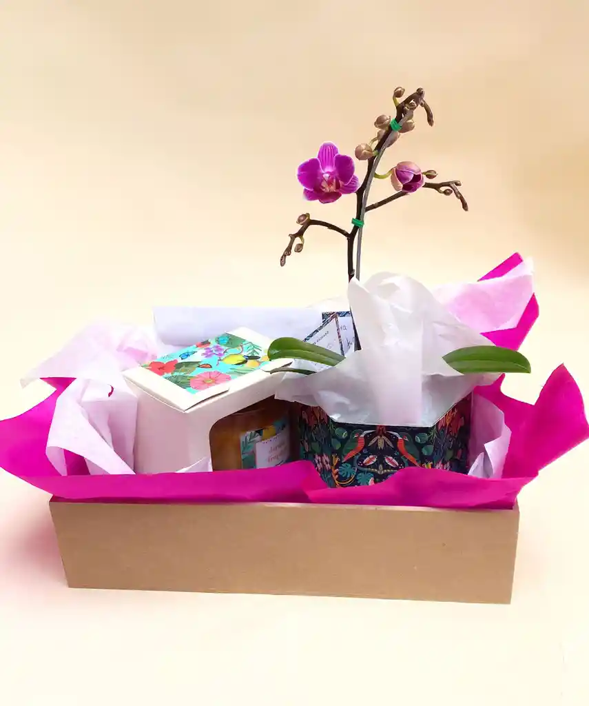 Combo de orquidea de dos varas de 60 cm de alto; en matera de plastico transparente, empacada para regalo en caja de carton hexagonal con motivos de la fauna y flora colombiana, con vela aromatica con aroma a frutos amarillos. El color de la orquídea puede variar.