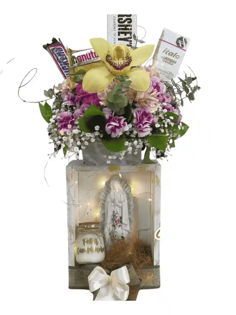 Un obsequio que ilumina el alma: virgen con luces, rodeada de velas, orquídea fresca y dulces para endulzar el momento.