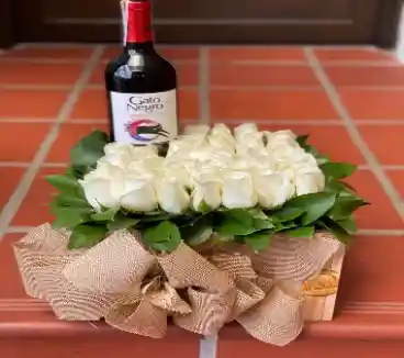 Arreglo floral con rosas y botella de vino de mas follajes, moño y tarjeta personalizada.