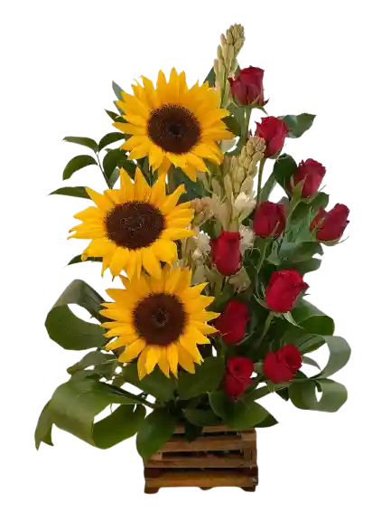 Contiene: Base de madera, 12 rosas rojas con 3 girasoles y follajes e incluye tarjeta personalizada 💖 Este arreglo expresa amor apasionado con alegría, una combinación perfecta entre romance y luz.