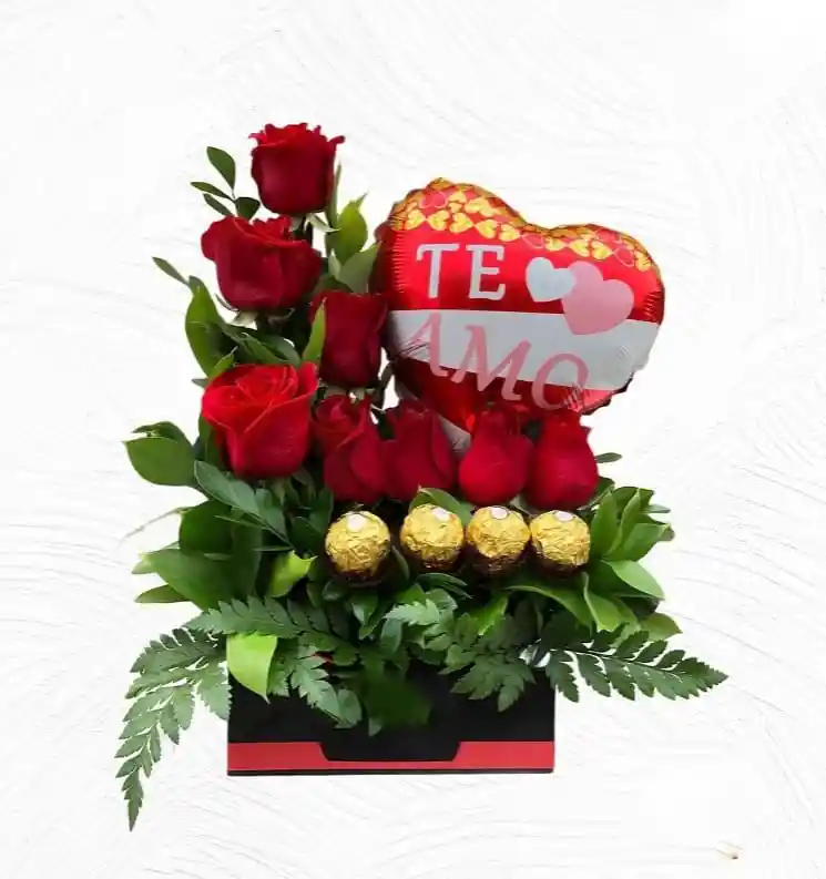Hermoso arreglo arreglo x 8 rosas + globo del motivo+4 chocolates puede variar la marca y tarjeta mensaje