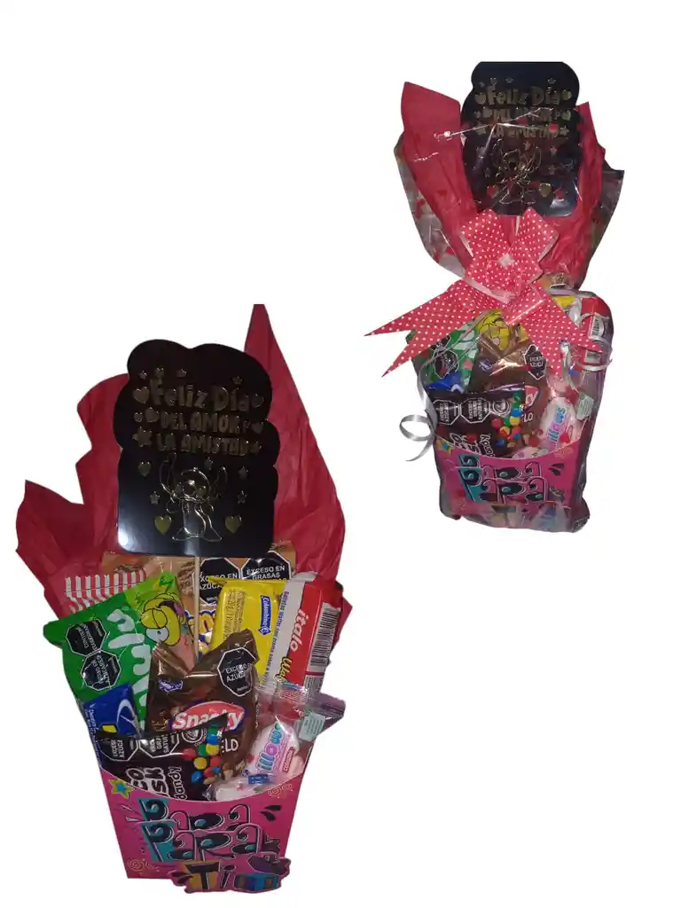 Arreglo de amor y amistad ( dulces surtidos, + pin) caja de color surtido +mas moño