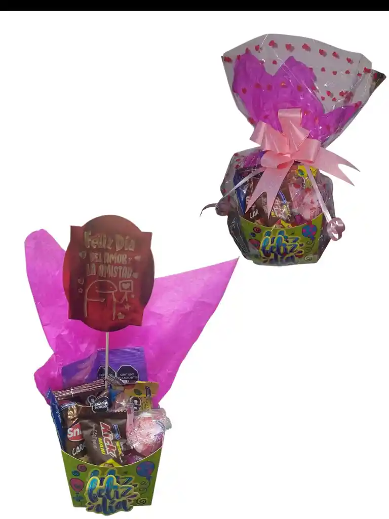 Arreglo de amor y amistad ( dulces surtidos, + pin) caja de color surtido +mas moño