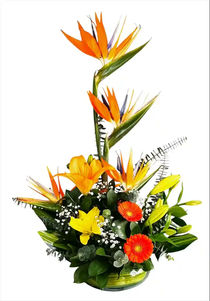 Exprésate con este delicado y colorido diseño floral que combina aves del paraíso, lirios y gerberas, dispuestos en una elegante boina de vidrio. En tonos vibrantes y alegres, este arreglo es perfecto para transmitir amor, gratitud o ternura en ocasiones especiales como aniversarios, cumpleaños, San Valentín o momentos de recuperación.