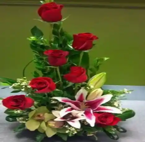Arreglo floral con rosas, orquidea, lirios y follajes mas tarjeta.