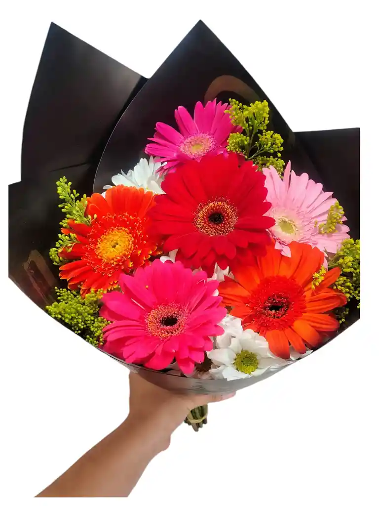Buquet de margaritas, gerberas, aster, moño, papel coreano ( varia el color dependiendo de la disponibilidad )