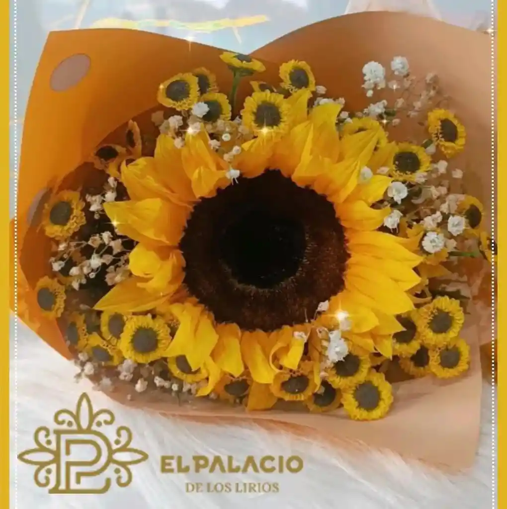 Hermoso arreglo de girasol con coquetasy gipsofilia. papel coreano