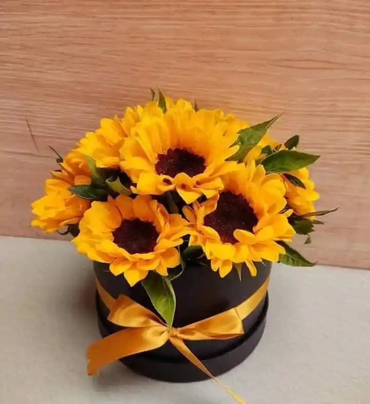 Arreglo floral con 6 girasoles, caja negra, moño amarillo y tarjeta con mensaje, si desea mensaje puedes dejarlo en la descripción o escríbenos al WhatsApp 3113612759